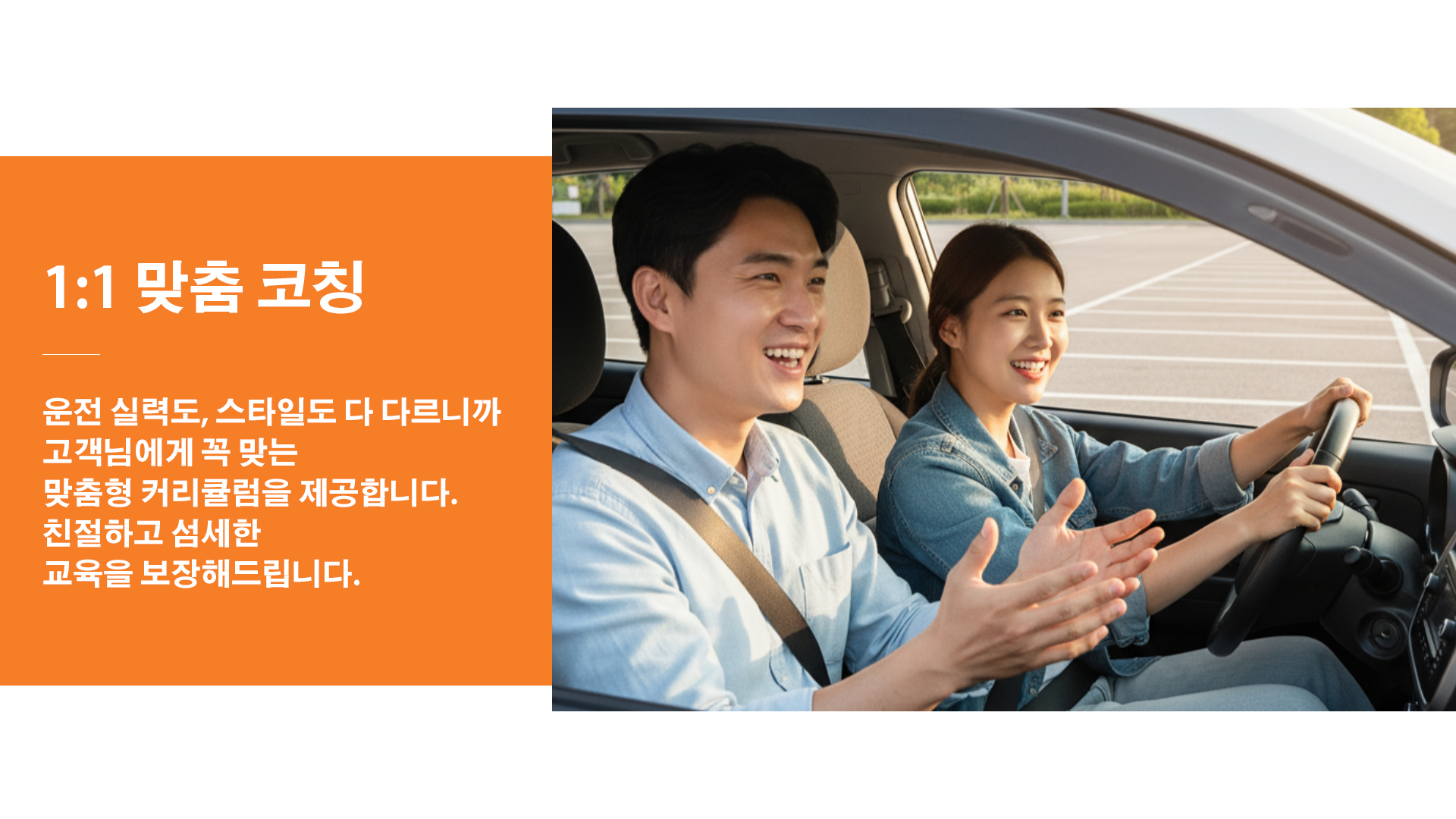 A7. 연수 시간, 차량 선택(연수 차량/개인 차량), 코스 난이도 등에 따라 달라지며 상담 후 맞춤 견적을 안내받을 수 있습니다.